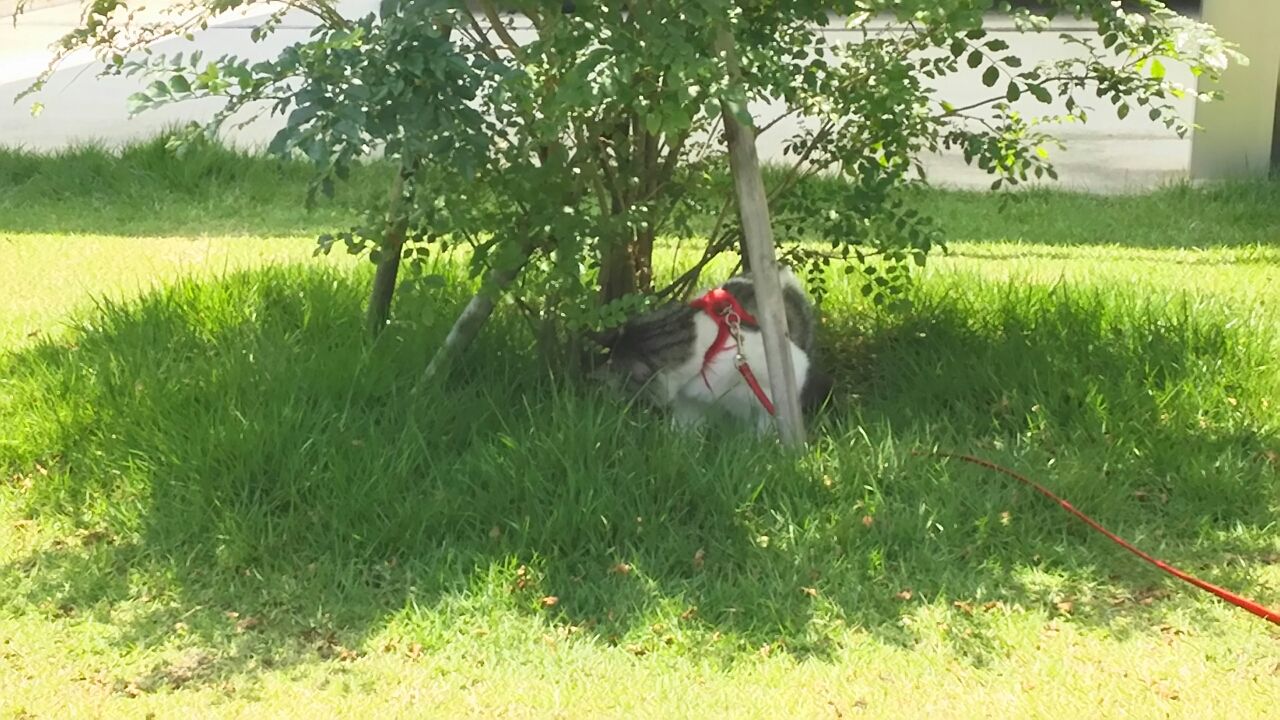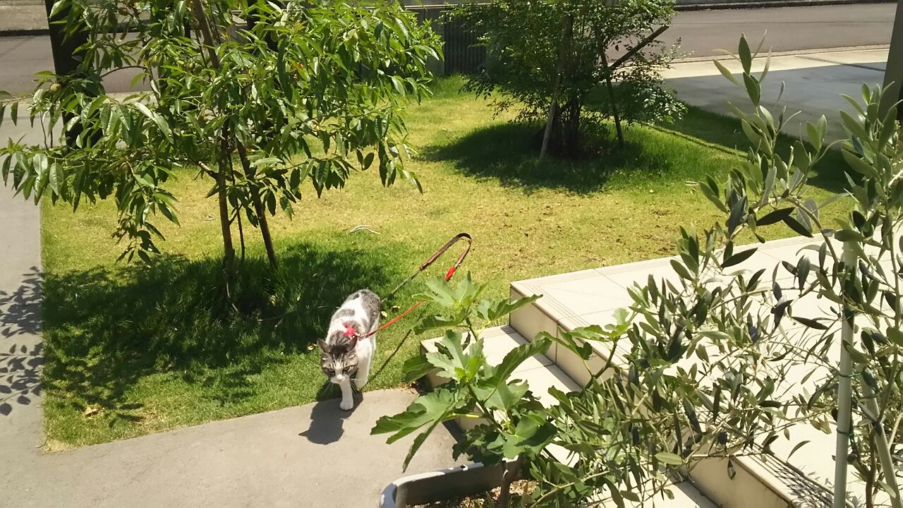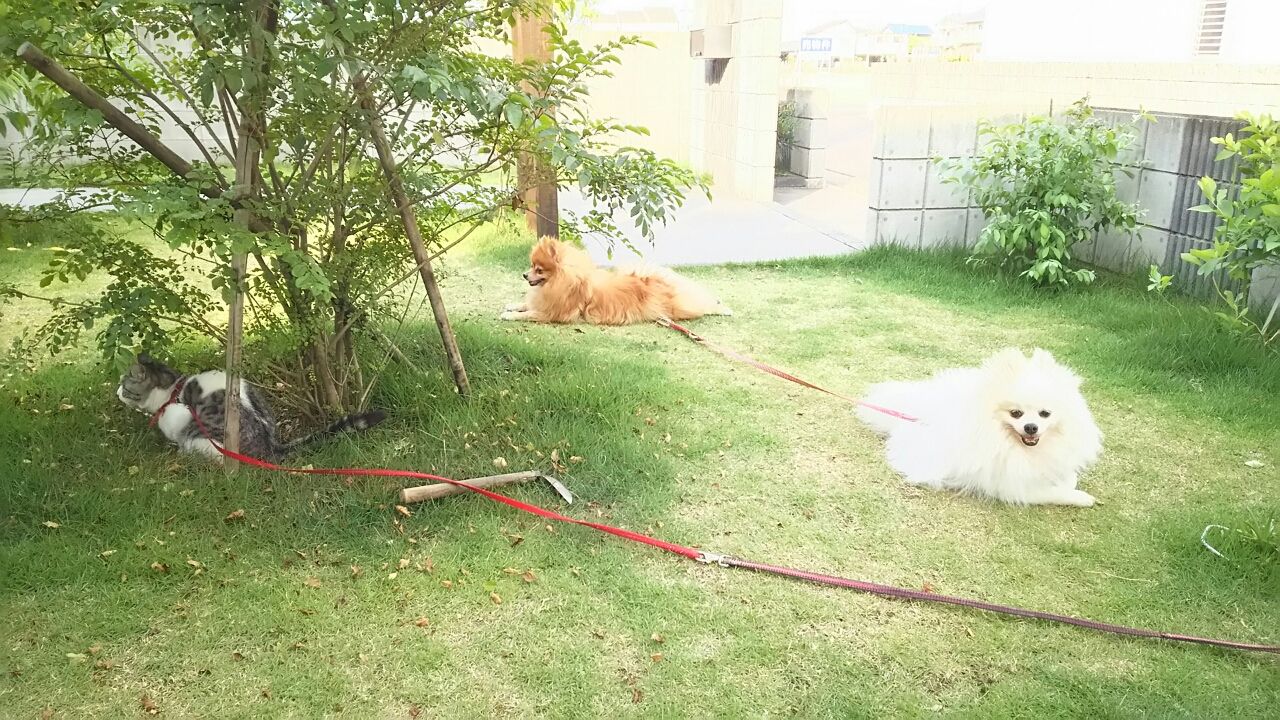 でもでも それでもみんな(マイナス1)お外が好き お外に出たいんですんな訳で 夕方4時頃には もう待ちきれずに外に出ます(庭は南南東向き この時間になると大分家の影の中に入ってきます)それに 多少暑くとも(貴方達の毛皮 季節に逆行 特注品みたいだもんね) 気にしません