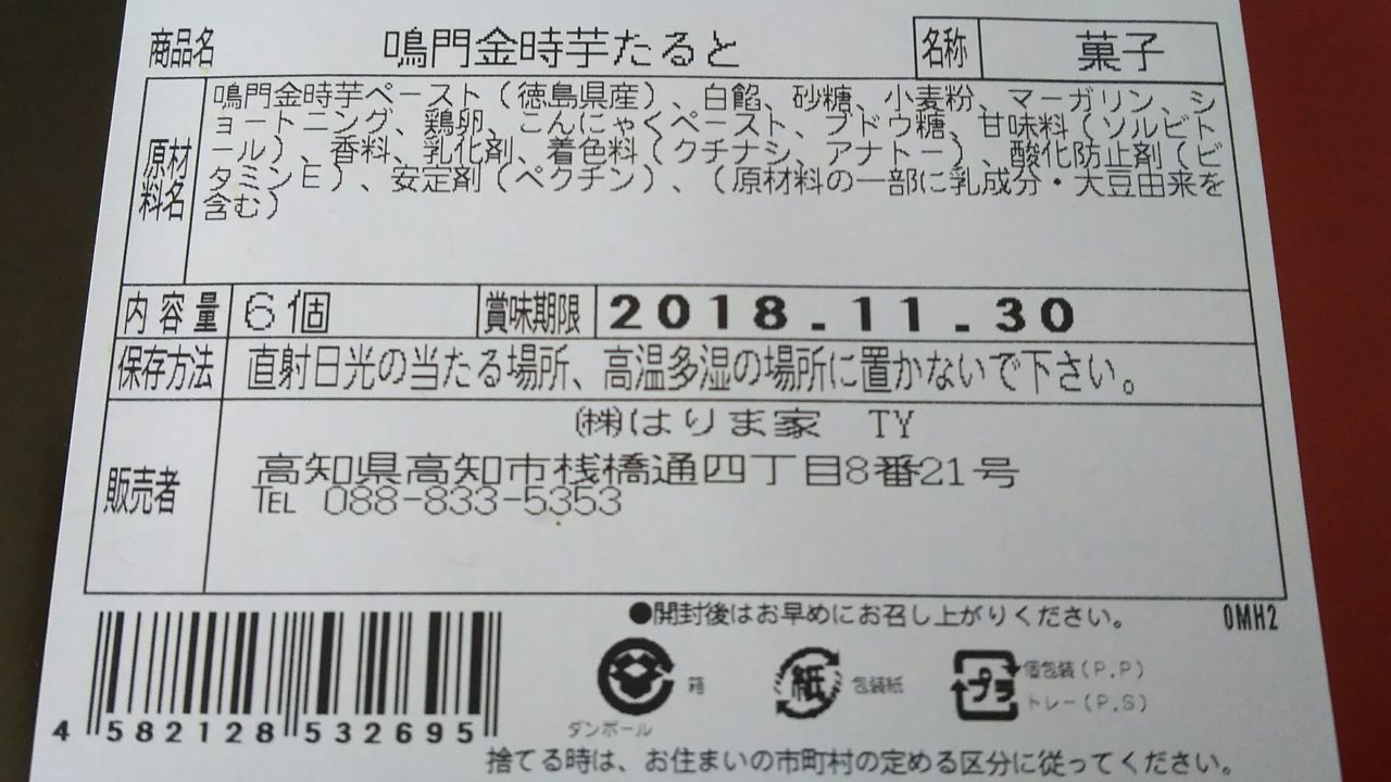 当然お隣の徳島県のお菓子と思って買って来た訳なんですけどぉ・・・先ほど裏面を見てびっくり ななんとまさかの高知県の業者が販売者・・・さつま芋の鳴門金時は徳島県の名産品な訳でして・・・