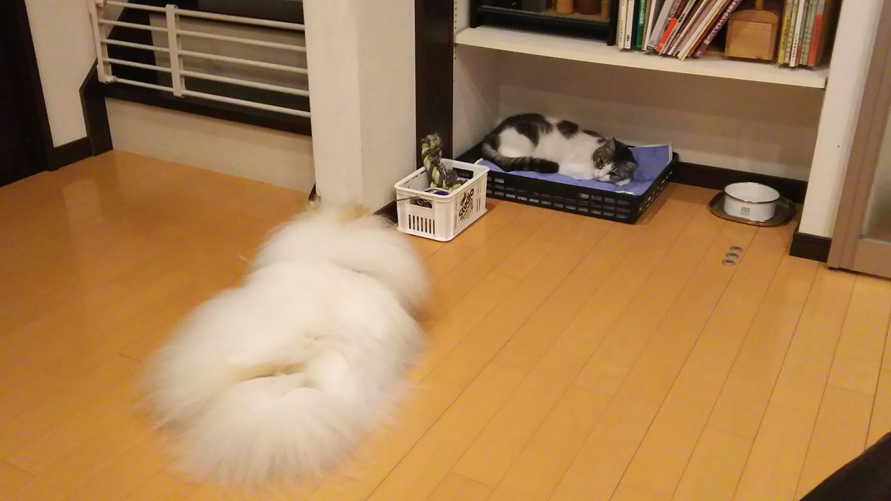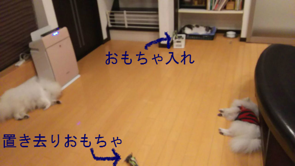 この後 おもちゃ入れまでぽん太郎君がおもちゃを取りに行き 夢の目の前でおもちゃをガジガジして遊ぶも 夢はリラックスモード