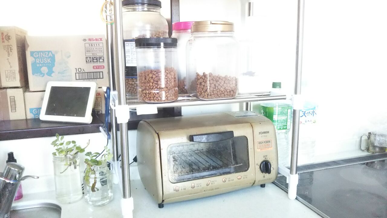 犬猫カリカリ・それを計るスケール等を置いてるキッチン棚
