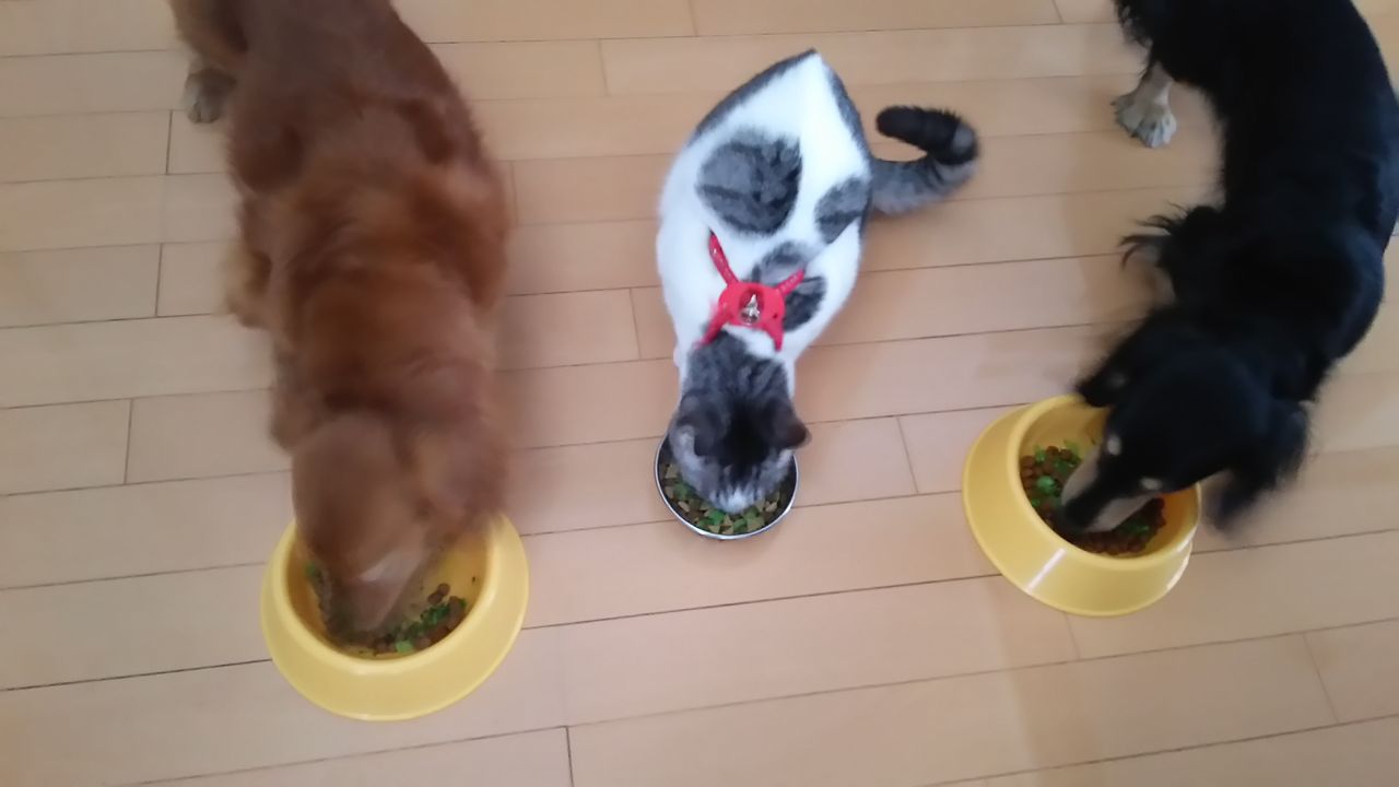 夢ちゃんは ちょっと好き嫌いがあるので(人参とか大根とか 根菜類はノーサンキュー レタスきゃべつも好みじゃない様です) わんずと同じ様に毎日野菜トッピング有り ではありませんが 今日は ブロッコリーなので 一緒に美味しく頂ける日ですぅ・・・