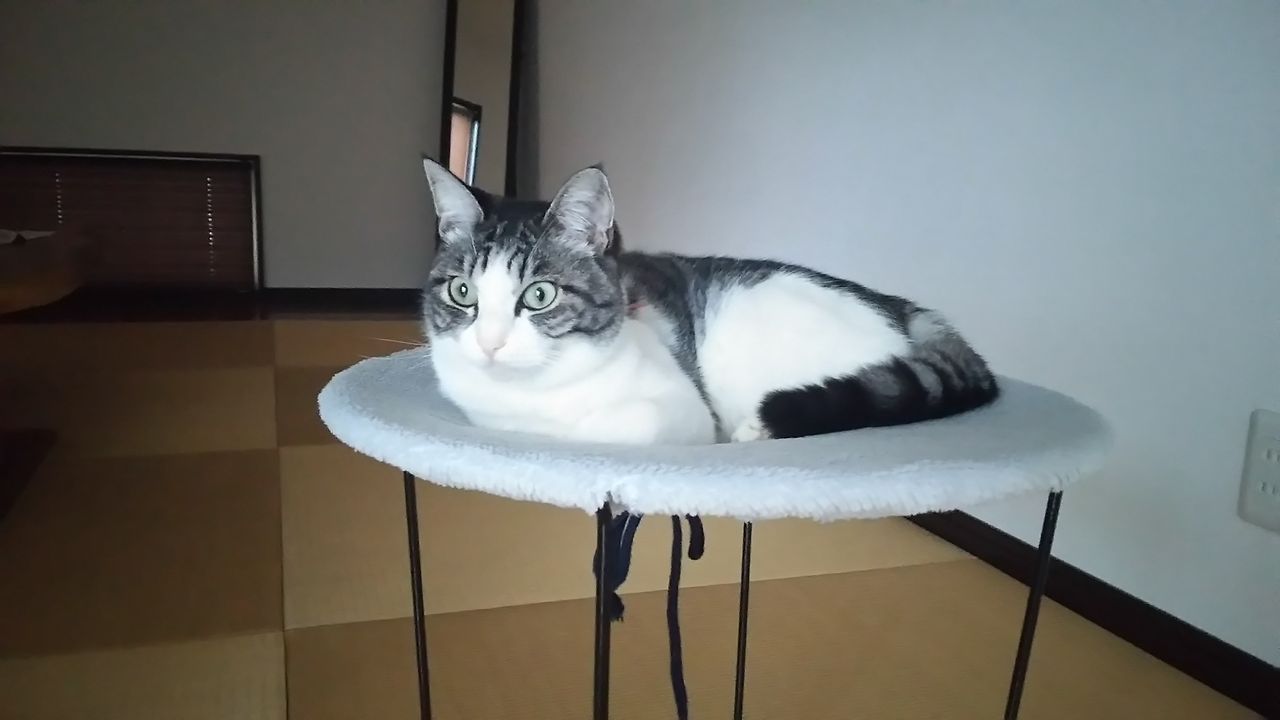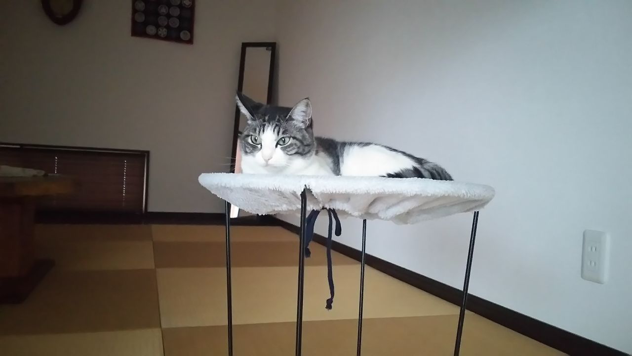 切れ目をスタンドにあわせ 紐を通してキュッと引っ張ればおしまい逆立ちしてるのを戻して おもむろに はぁ~い 夢ちゃん いらっしゃいなぁ~ と夢を呼び 謹んでそこに載せたら お嬢さまに座りごこちの感想を聞く・・・ ? 何なんですか これ・・・?いきなり現れた高台に載せられ 若干表情が硬い夢ぽんちゃん