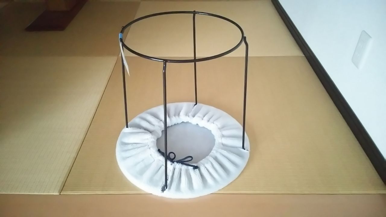 スタンドの大きい方の輪より さらに14cmくらい大きめにシーツを切りとり 輪の大きさに合わせて4箇所に切れ目を入れたら ほつれないように周囲にミシンかけ 最後に折り返して紐を通せるようにすれば 完成(楽勝ソーイング