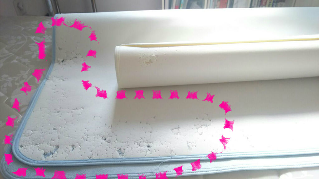 つまりこれ 一生懸命布団とおねしょパットの間に手を突っ込み 闇雲にガリガリした爪痕な訳(だから縁に沿ってぼろぼろ・・・)