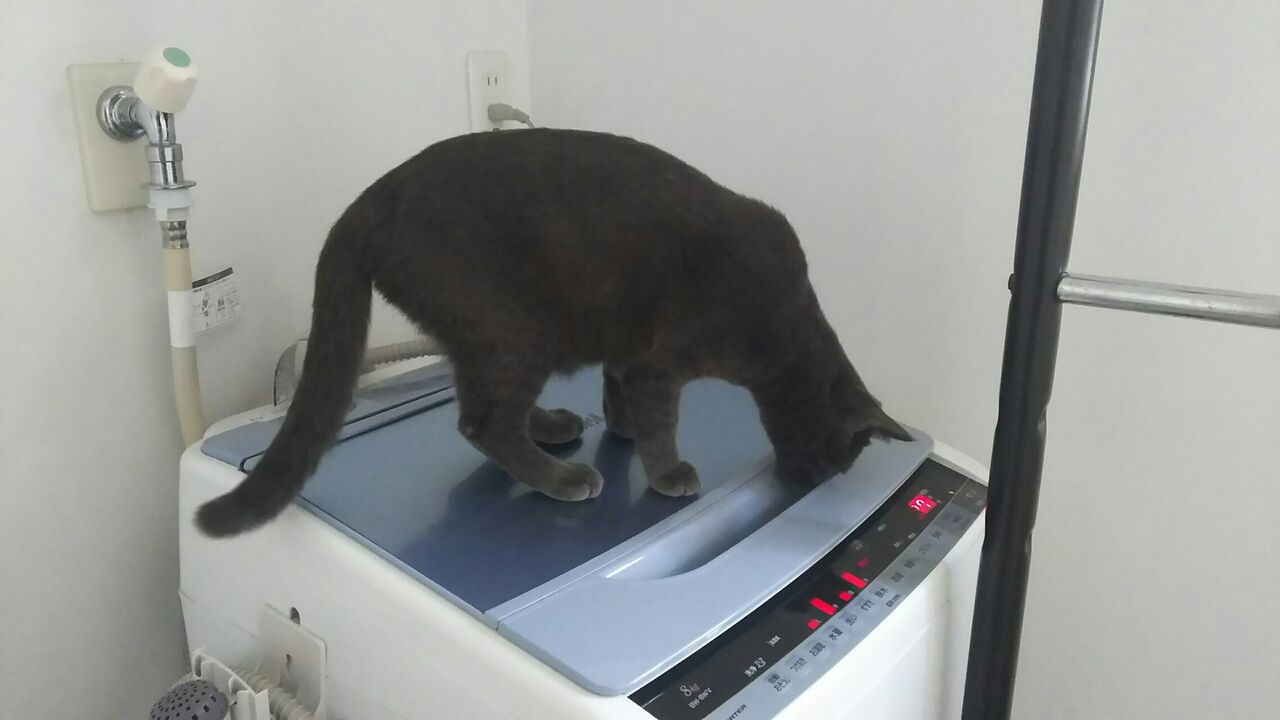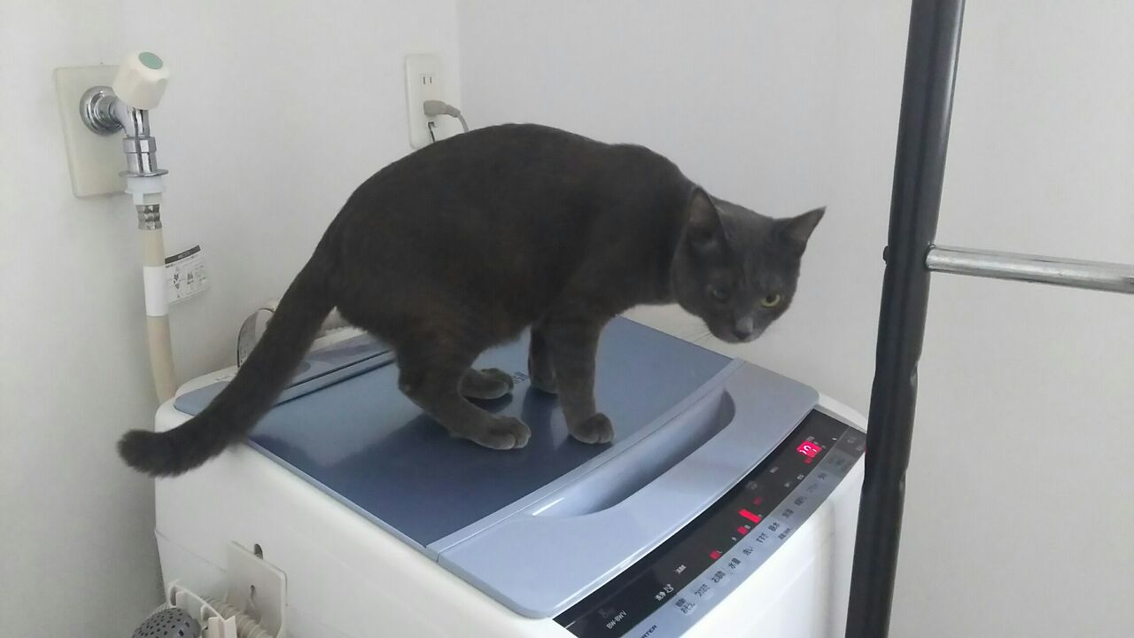 今日は洗面台経由で洗濯機(稼働中)の上に載ってます