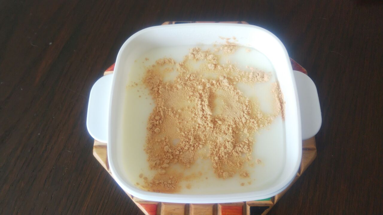 牛乳・牛乳の6%砂糖・牛乳の7%コーンスターチに黒蜜ときな粉をかけて頂く 私のお薦めです