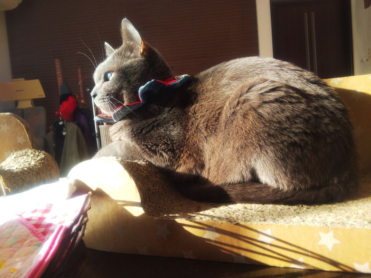とはいえ むぎちゃんの大好きなこのクッションの所には 悲しいかな陽射しが届きません(エアコンの風はよく届くけど)