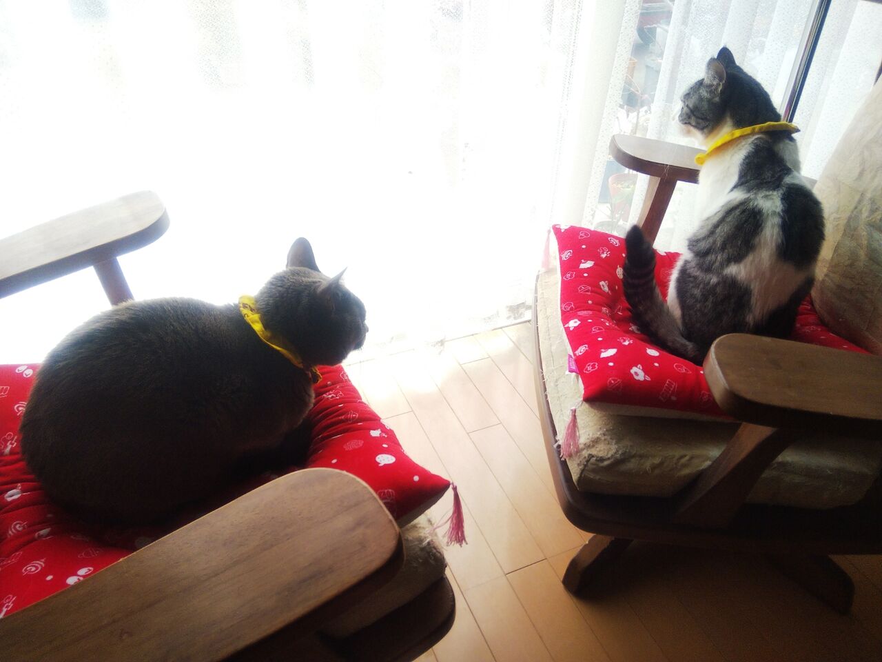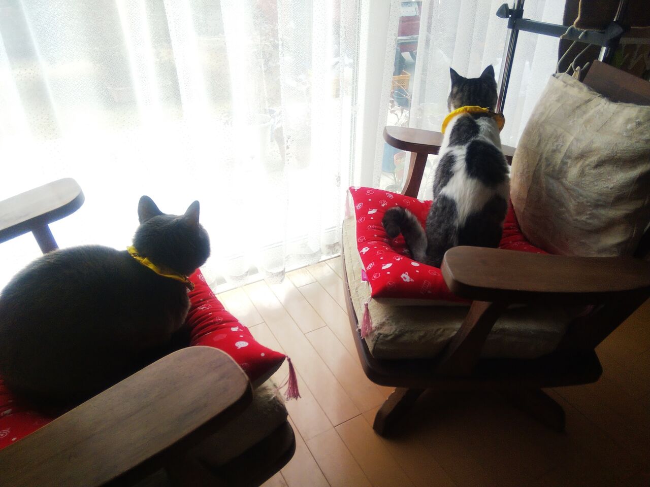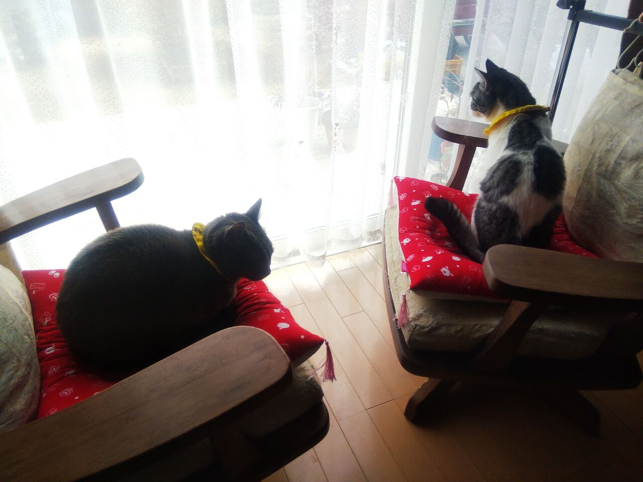 写真は 帰宅後未練たらしく外を眺めてる夢 と 迷惑千万顔のギイ)