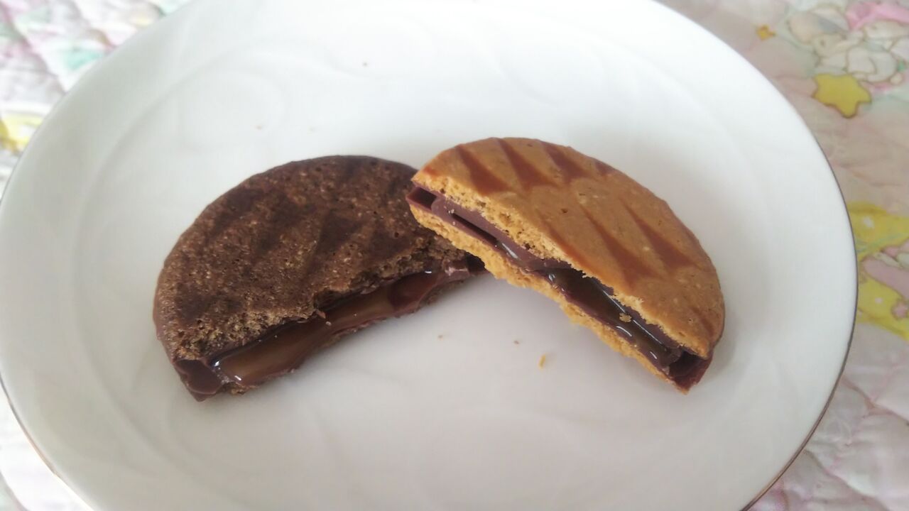 キャラメルをチョコレートコーティングしてクッキーで挟んだ